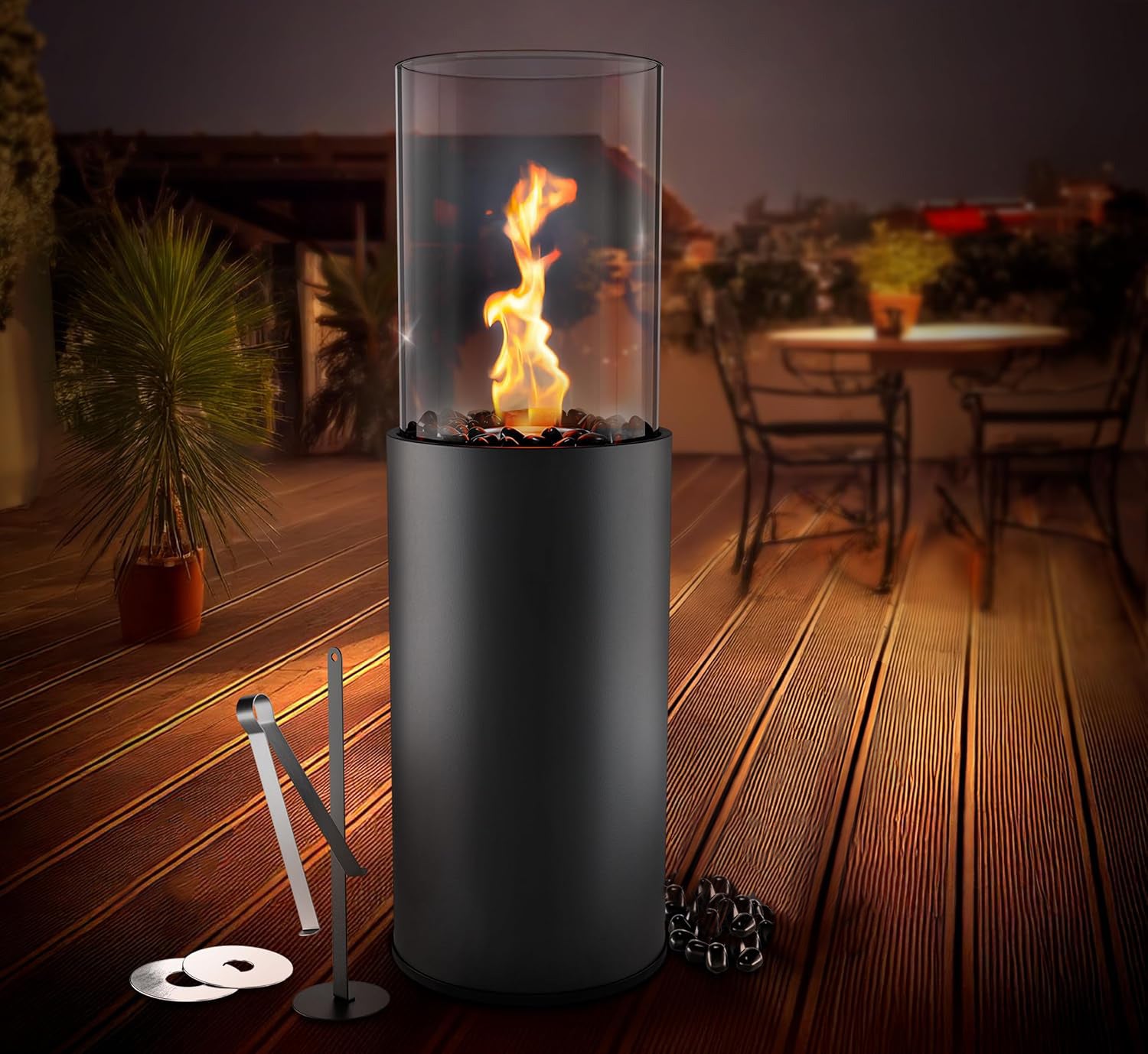 Each fire pit includes the burner unit, a stainless-steel fuel chamber, and an extinguishing tool. Some models may also include decorative stones or a protective base.